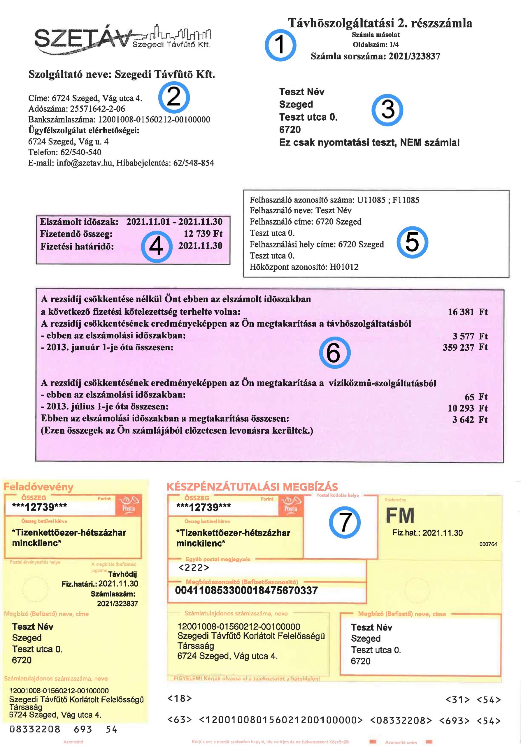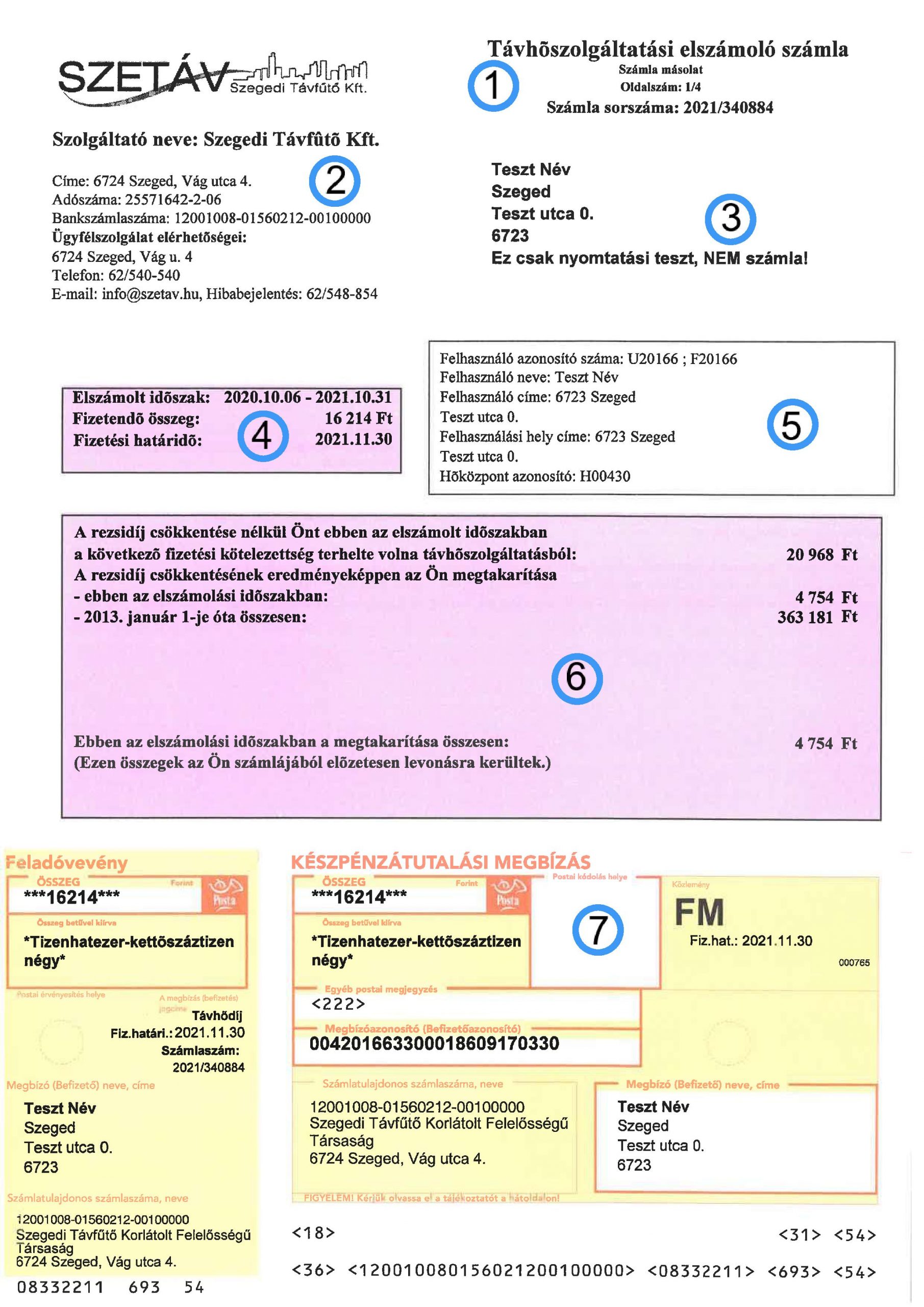 7. Számla fizetés módjához igazodó számlarész. Készpénzátutalási megbízás esetén a géppel teljes körűen kitöltött, a perforáció mentén sérülésmentesen leválasztható csekk, csoportos illetve pénzintézeti átutalás esetén fehér mező.