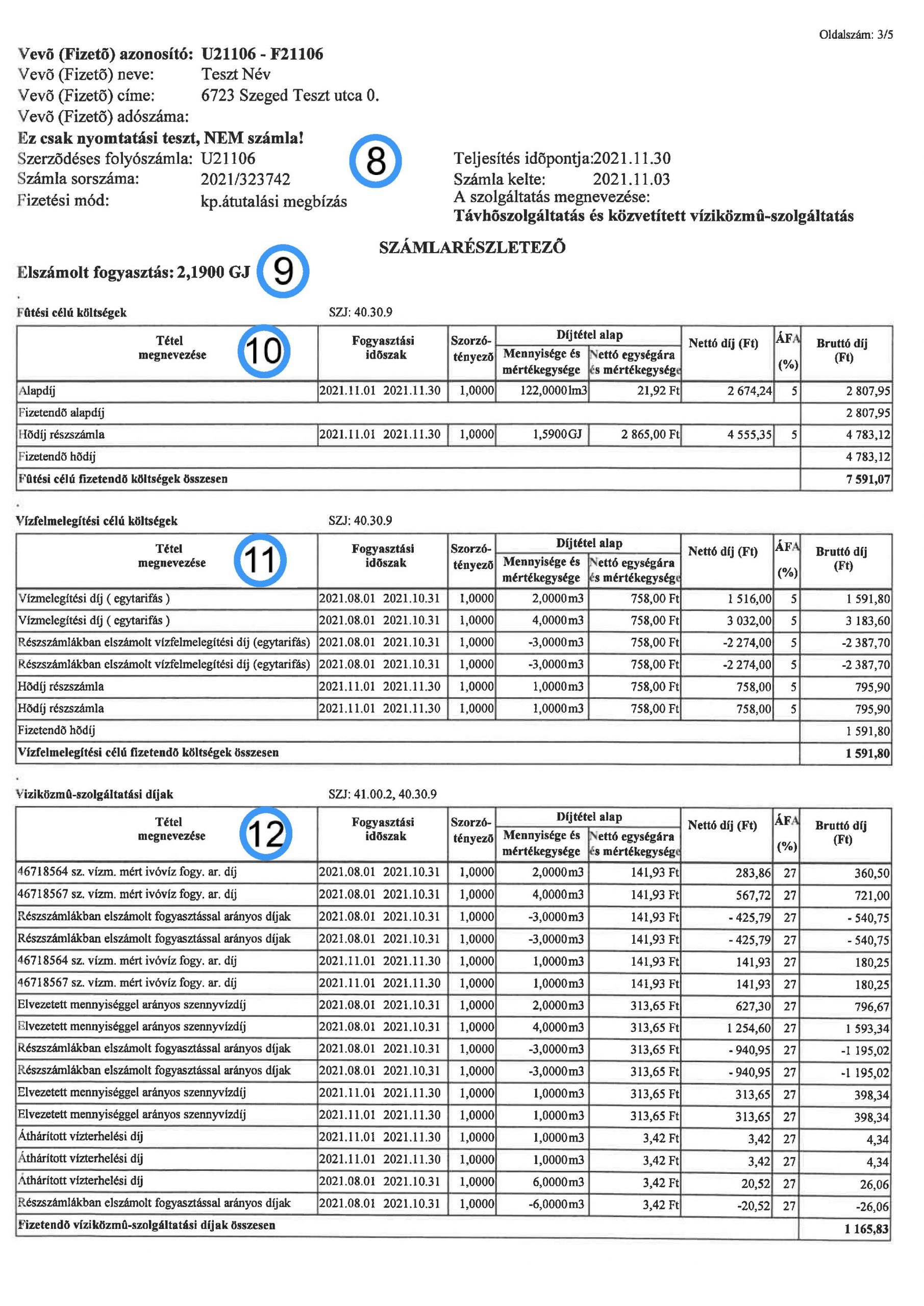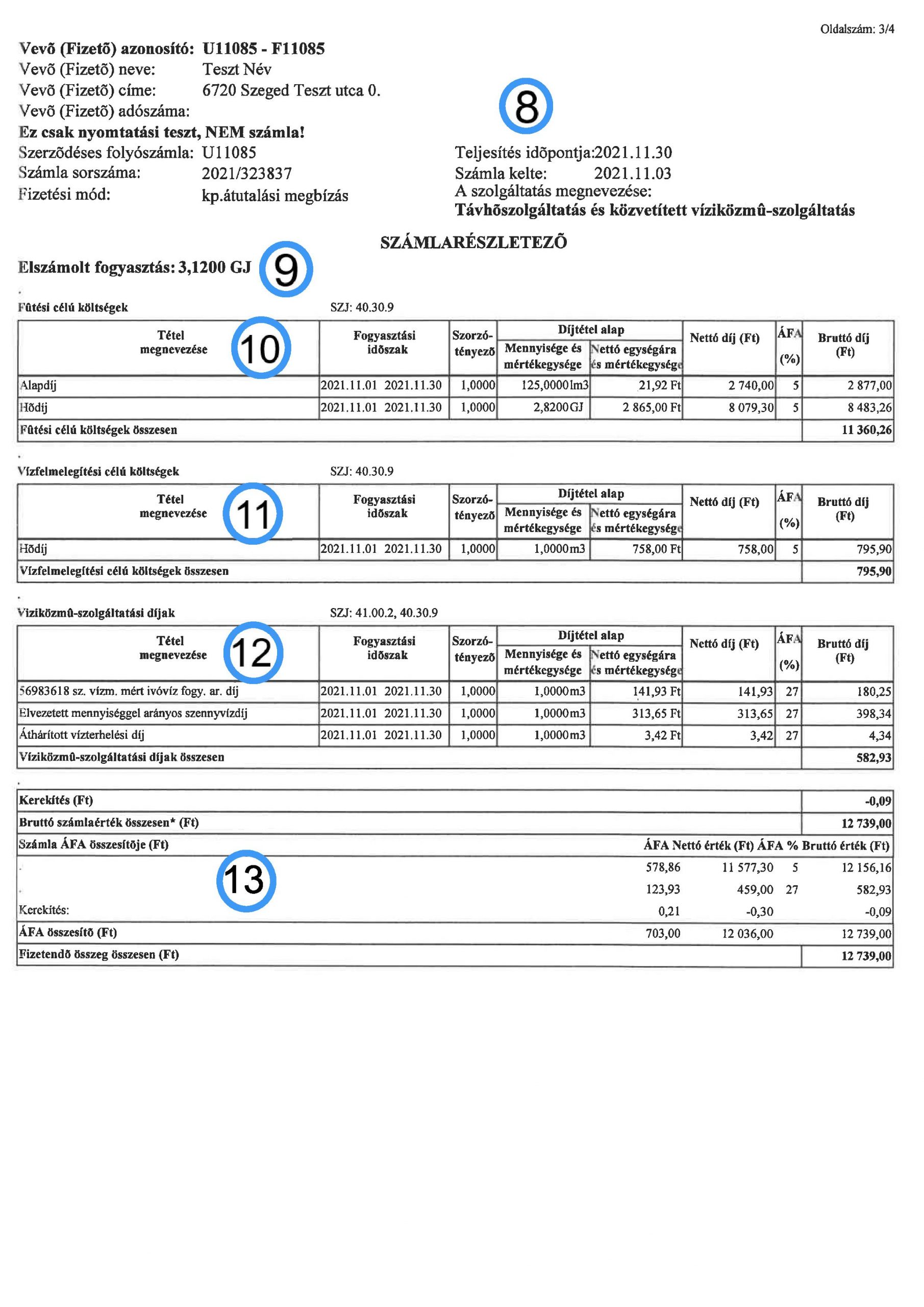 13. A 10-12. számlaboxokban elszámolt bruttó díjtételek összesítése. Itt kerülnek kerekítésre egész számokra a nettó, az ÁFA és a bruttó díjak. A számlamező utolsó sorában a fizetendő szolgáltatási díj kerül feltüntetésre.